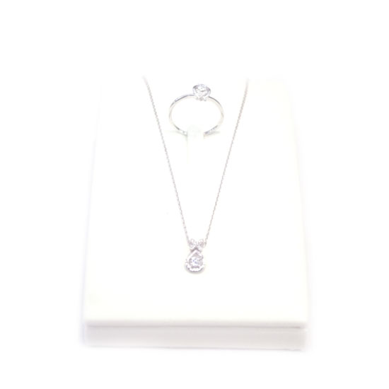 This is an elegant jewelry set with a necklace and a finger ring. It is crafted with dazzling diamonds on the 18K white gold setting for an elegant touch. This jewelry set is an ideal addition to complete your jewelry box.