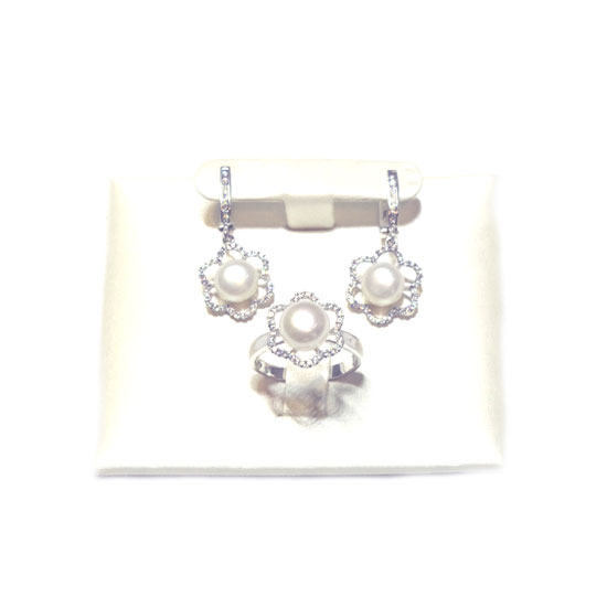 This is a fashionable jewelry set that includes a pair of earrings and a finger ring. The 925 silver construction shimmers with a high-gloss finish. The large pearl is well paved on the floral setting.