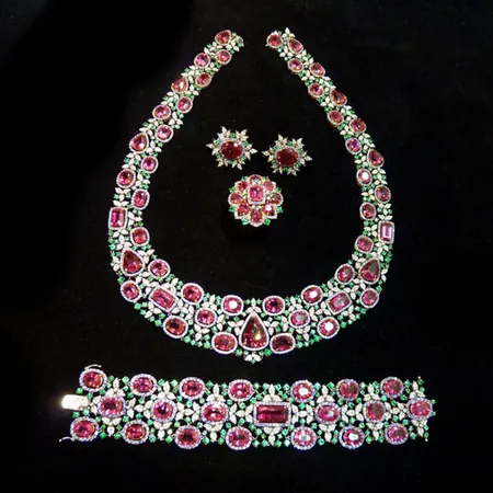 This is a gorgeous jewelry set with a bracelet, a necklace, a pair of earrings and a finger ring. It is finely designed with dazzling diamonds, emerald stones, rubellite stones and sapphires for an elegant touch. This luxurious jewelry set will surely make you stand out from the crowd.