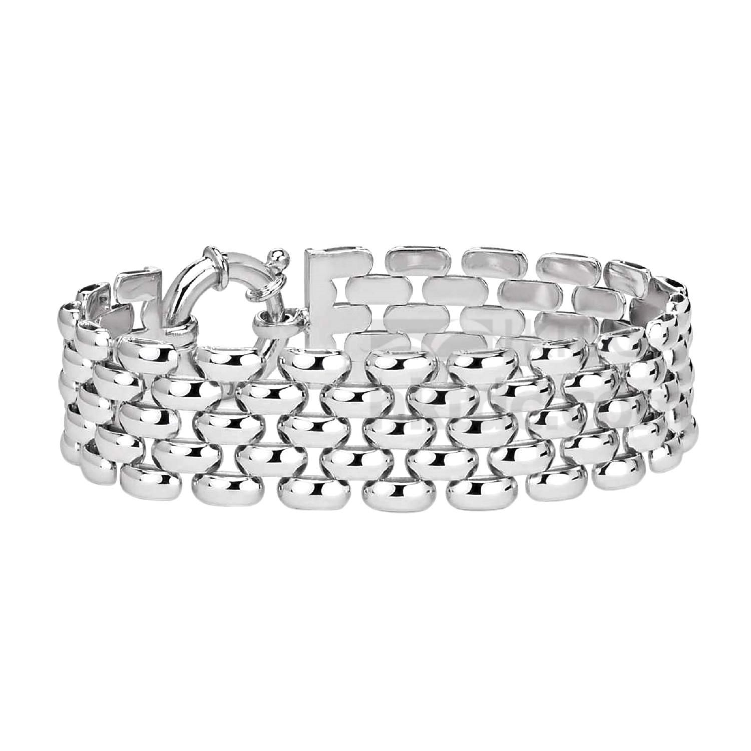 • Five layers of hollow curved silver bars create this sleek linked bracelet. An oversized spring ring clasp makes getting it on and off a breeze.