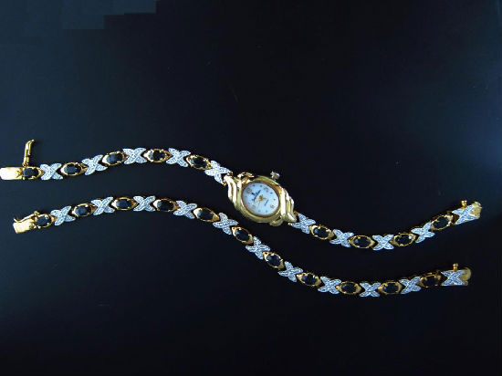 The displayed jewellery watch and bracelet are elegantly designed with Genuine Blue Sapphire. This watch features an oval case in gold tone and has alternating stones in contrasting colors on the band. It flaunts a refined and fashionable style and will be an impressive set for ladies.