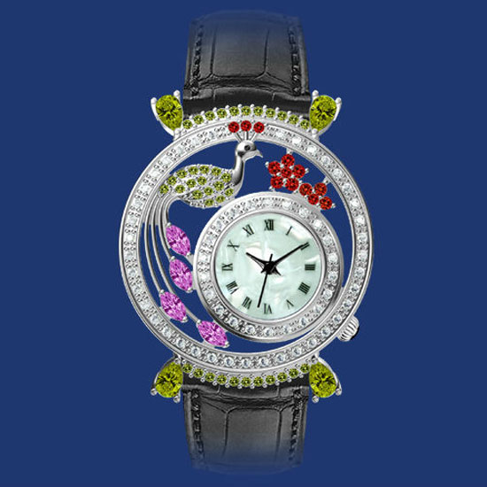 This jewelry watch features a small round dial with a peacock decoration beside it. Its main body of is fitted with multicolor CZ stones. The well-designed watch goes well with your elegant outfits.