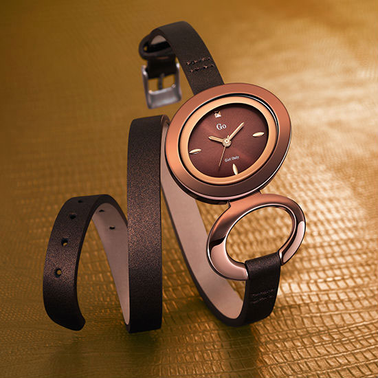 This is a jewelry watch boasting a fashionable and stylish design. Its oval case and link are designed in warm colors with a high-gloss finish. The curved double genuine leather straps add a touch of uniqueness to this design.
