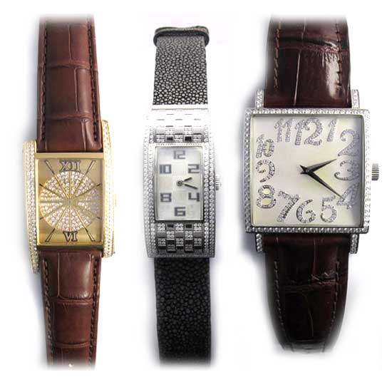 These watches featured here are in classic and retro designs. The watches are equipped with genuine leather straps and a case embraced with sparkling stones. These watches are the perfect piece to showcase your style in time-keeping.