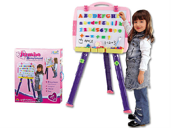 Jumbo drawing board with 88 magnetic letters & numbers & symbols, 1 erasable water pen, 1 spongy eraser, 4 storage trays.
