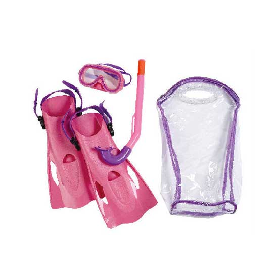 This junior diving combo set comprises two belt fins, a transparent carrying bag, a lens mask and a purge snorkel. It boasts robust construction for a long service time. This pinkish diving combo set enables juniors to explore the undersea world safely.
