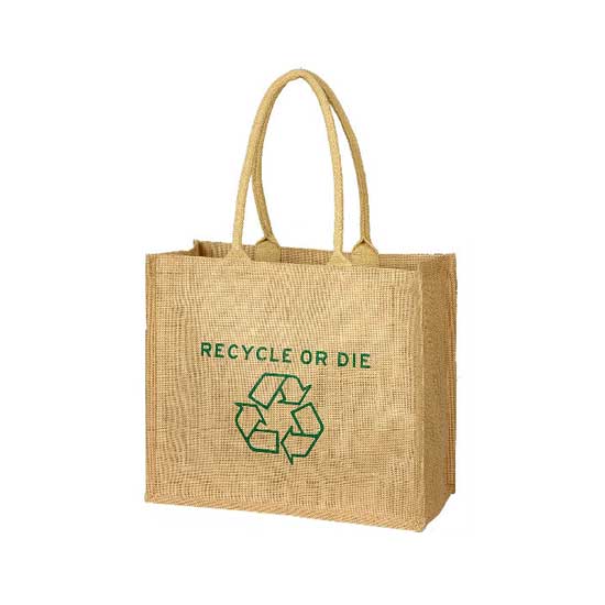 This rectangular bag is made of natural fiber fabric for durability. It comes with two sturdy handles and green patterns at the front. This popular bag is widely adopted for shopping or promotional use.