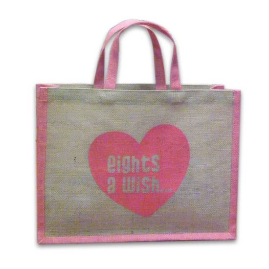 This is a jute shopping bag printed with pink patterns. It is tough, reusable and environmental-friendly, which is suitable for carrying food and other groceries when shopping.