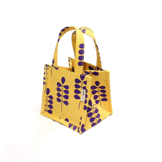 This pretty shopping bag features purple wheat-patterns printed on a yellow fabric. Flaunting a small volume, this bag is suitable for daily shopping or carrying your lunch box. Made with good material and durable construction, this jute shopping bag is a basic addition to your accessories.