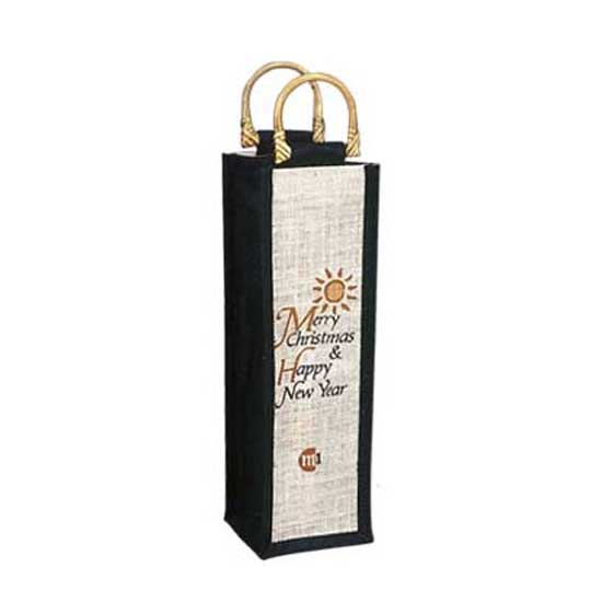 As shown is a nice wine carrying bag made of natural jute. The jute is dyed in black, while the front panel is kept in its original color and painted with colorful patterns. This beautiful bag suits the profile of your wine perfectly.