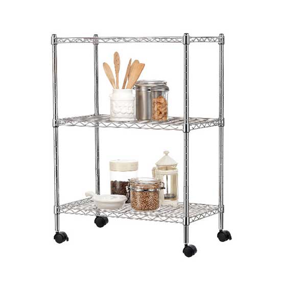 This movable storage rack comes with a K/D structure. It features 3 mesh layers and four robust wheels. The rack is made of high-quality metal to ensure enhanced durability.