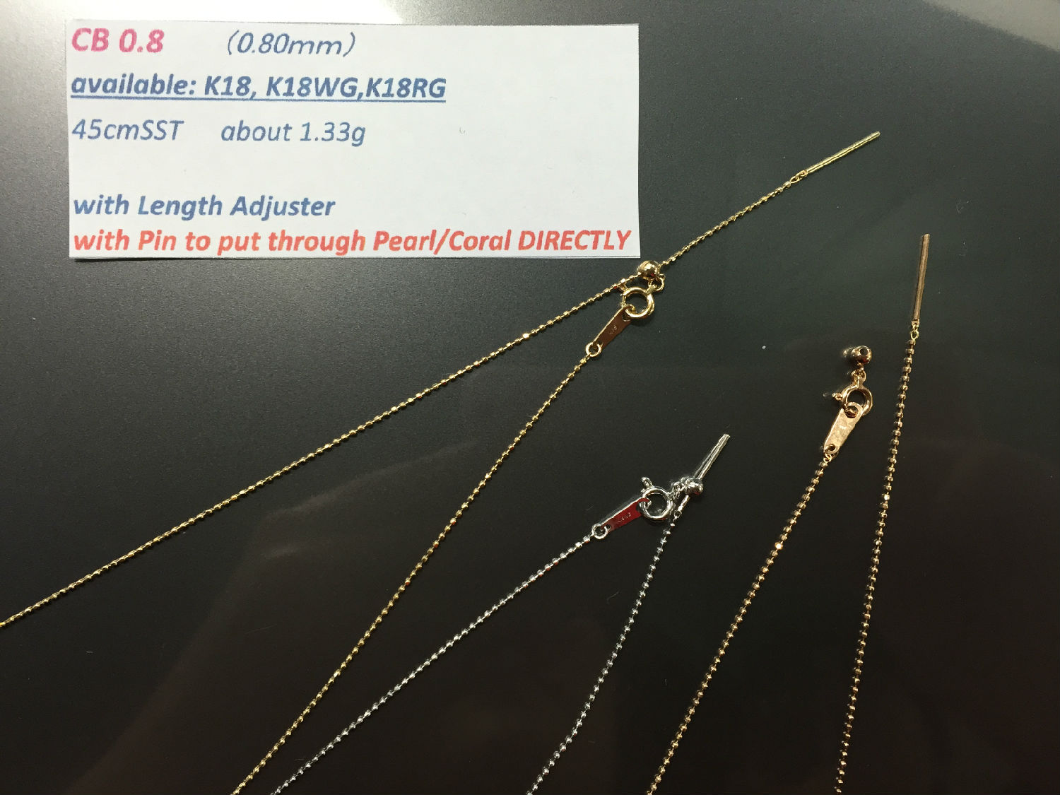 Very practical and beautiul chain with length adjuster and Slide Pin. This can have pearls, corals and so on directly without bale. Available in K18 and K18WG. 45cm, average weight is 1.33g. Diameter is 0.80mm. Stamp: K18
