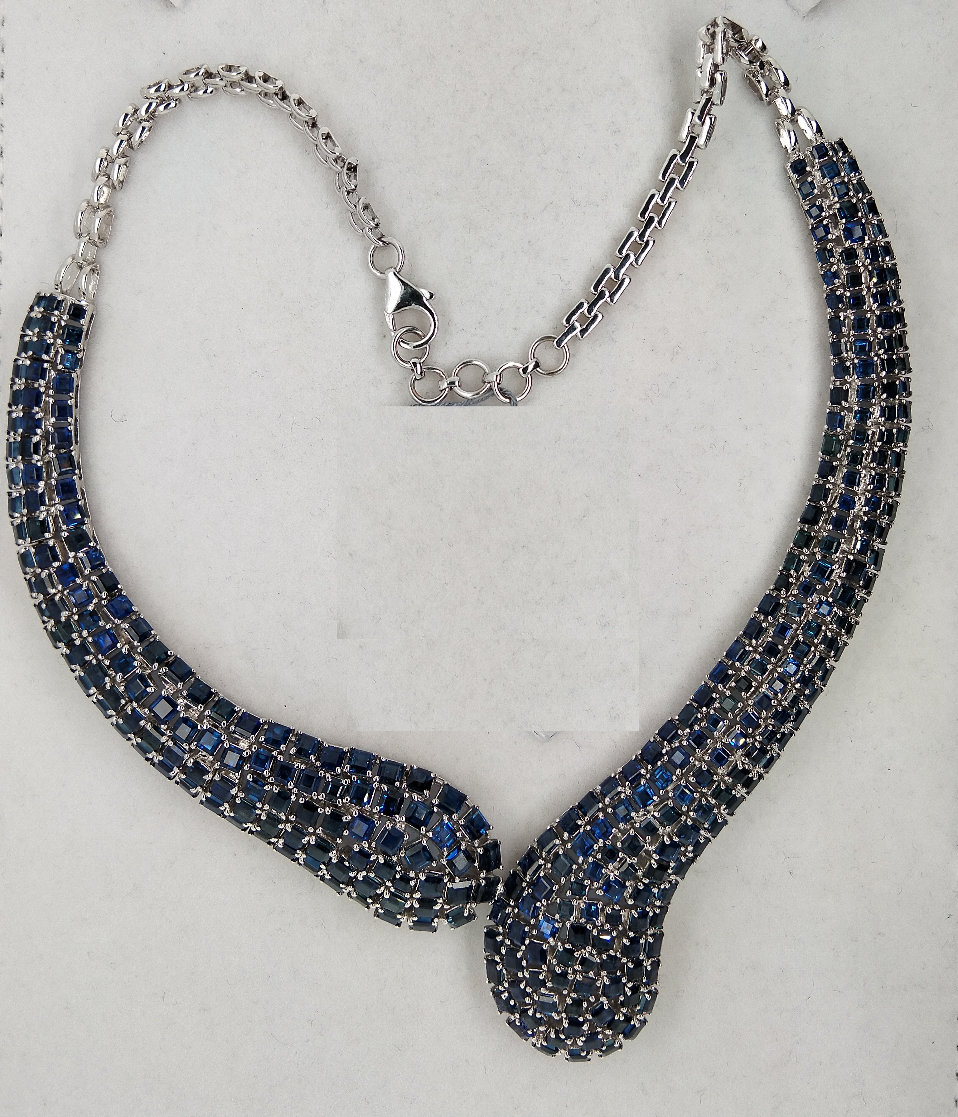 It is K18WG Sapphire Necklace. Total carat is 58.1 & total weight is 87.5 grams.