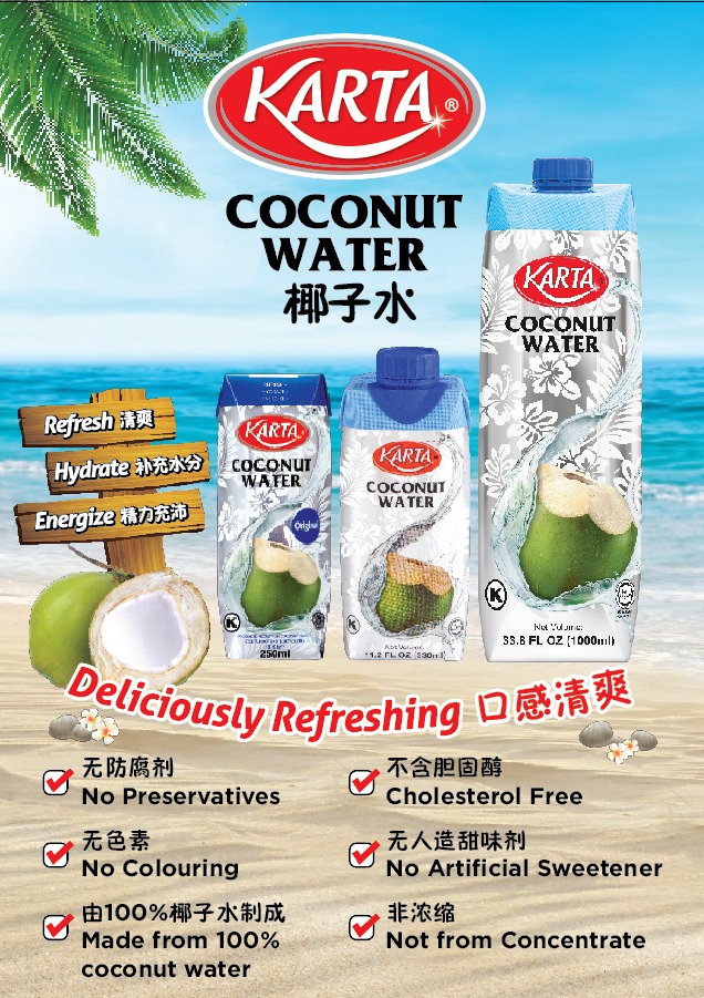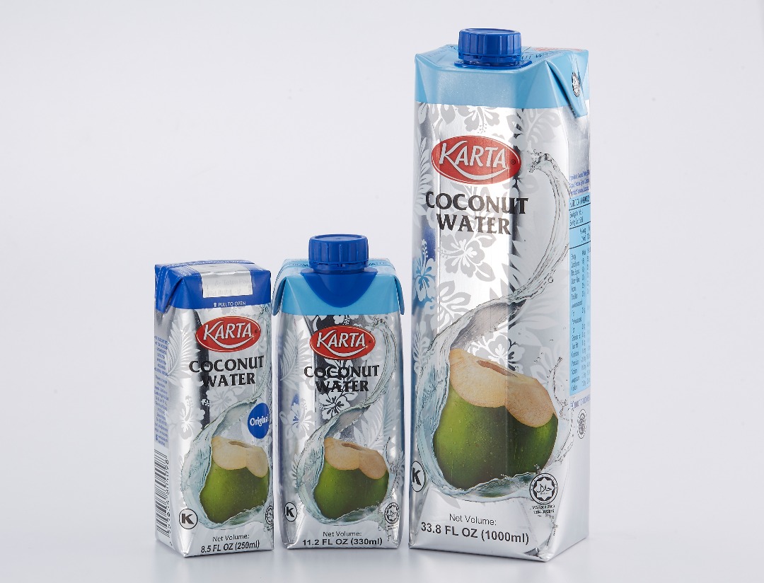 Karta coconut water is a refreshing ready to drink coconut water made with fresh coconut juice with splash of natural flavour. We have a variety of sizes to cater to different customer needs such as 250ml, 330ml and 1000ml. For seal integirty, product packed into Tetra Prisma 330ml and 1000ml’s seal will broken and punc- ture the pre-laminated hole as an indication that the cap has already been turn and open. For prod- uct packed into Tetra Prisma 250ml is protected by aluminium pull tab which is single use that is easily opened by peel back foil tab.