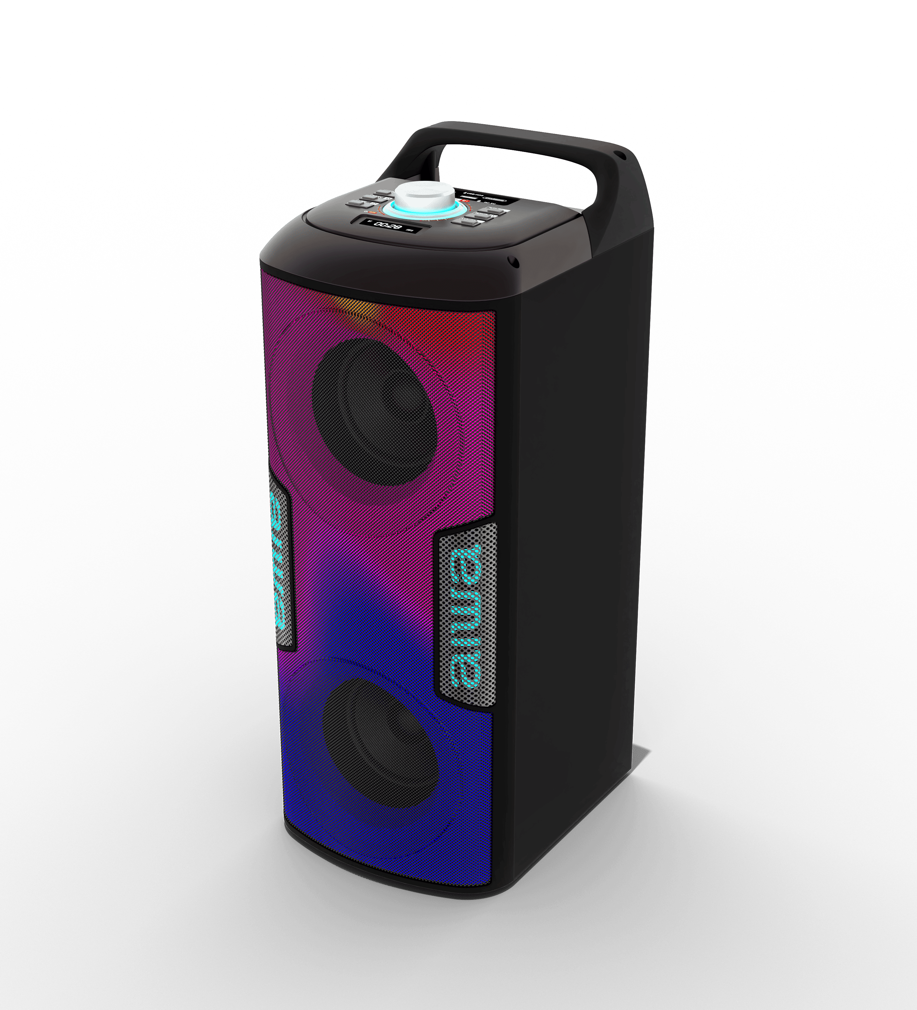 Unleash the ultimate party vibes with this 16W RMS HyperBass speaker featuring Bluetooth 5.1, USB, Micro-SD, AUX in/out, FM Radio, and RGB flame lighting. Built for portability with a retractable trolley handle, it includes a microphone, remote control, and precision controls for karaoke and audio customization. Perfect for any event!
