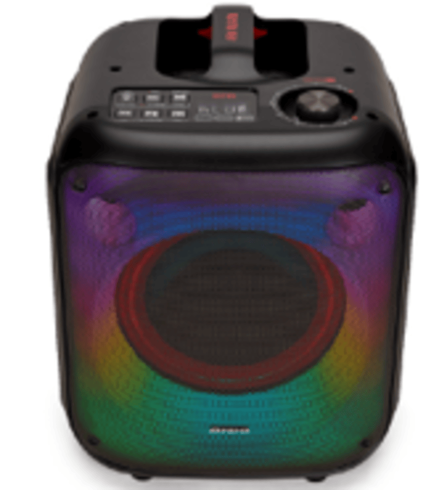 Output power of 300 PMPO and 40W RMS, featuring a two-way speaker system (8" woofer + 1" tweeter), frequency response of 80Hz-20kHz, RGB flame lighting with 10 modes, and Bluetooth 5.0 compatibility.