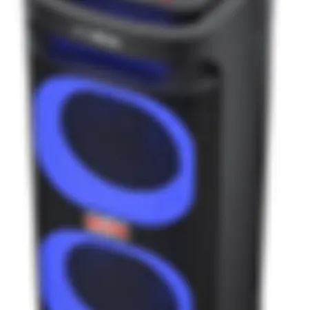 Bluetooth V5.0 with 10m range, 80W RMS output, and 800W peak power. Features 8" subwoofers (50W x 2) and 3" tweeters (15W x 2), with a 12V/4500mAh battery offering 75 mins playtime at 100% volume.