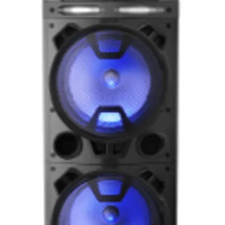 Trolley speaker with wheels, Bluetooth 4.2, and multiple inputs (AUX, USB, Micro SD, FM). Features include karaoke with 2 wireless mics, mic/guitar controls, 5-band equalizer, and LED light show.