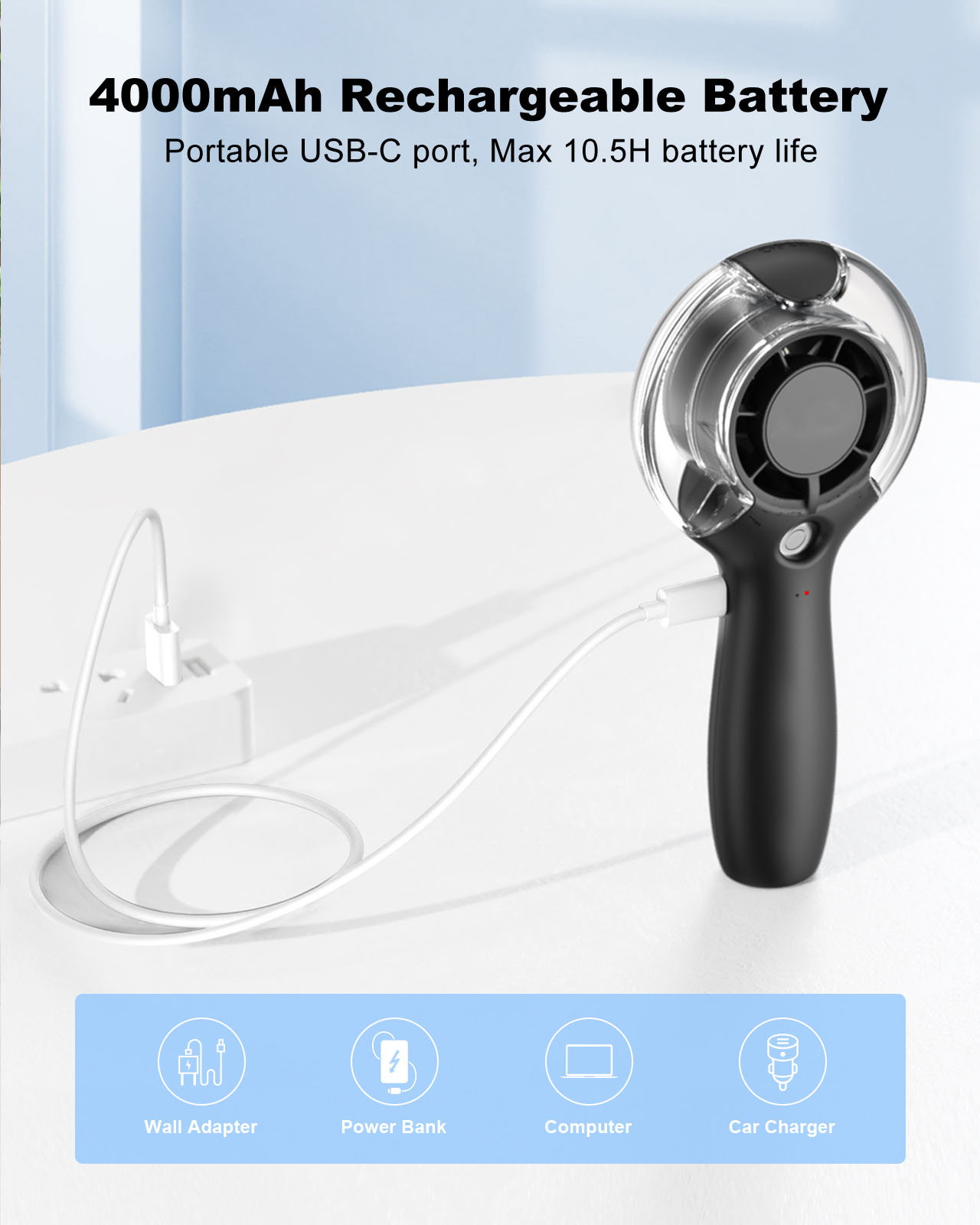 Ultra-high speed portable fan with misting function, 4 speed level & 2 misting mode, USB-C rechargeable & 4000mAh large capacity battery.