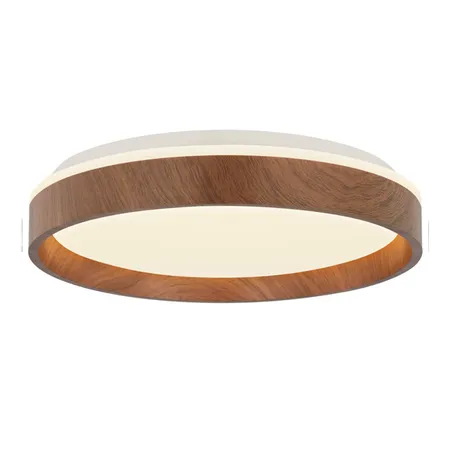 This is a circular ceiling light. There is a decorative strip with simulated wood grain around the edge of the lamp body, showing a natural tan tone and a rich texture. The center of the lamp is a milky white light-emitting surface that can provide soft lighting. The overall style is simple and has a natural and warm atmosphere, which is quite suitable for creating a comfortable ambiance in home spaces such as bedrooms and living rooms.
