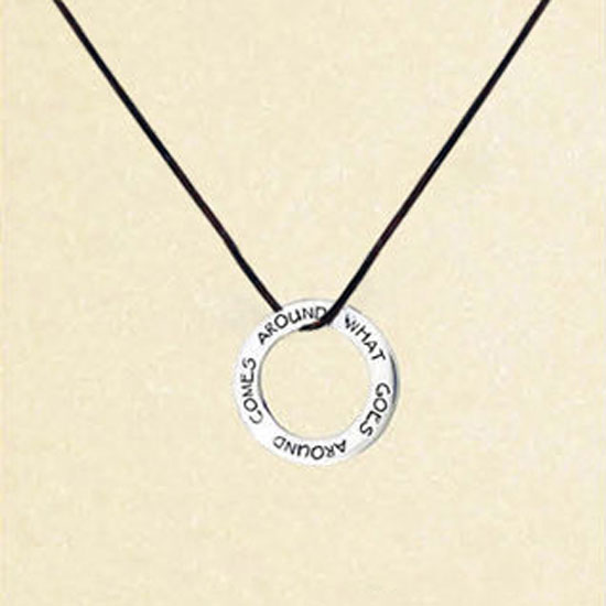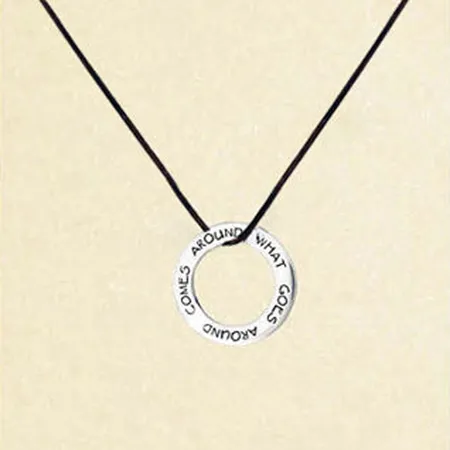 This is a karma silver necklace with a neat and simple design. It features a round pendant which is carved with the exquisite phrase "What goes around comes around". This necklace is completed with a black rope for a perfect finish.