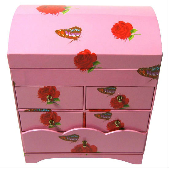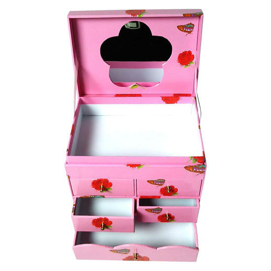 This keepsake case is made of 2 mm cardboard and has a metal knob. The case is rectangular shaped and has a total of six drawers. Its feminine pink appearance makes it a perfect match for jewelry items.
