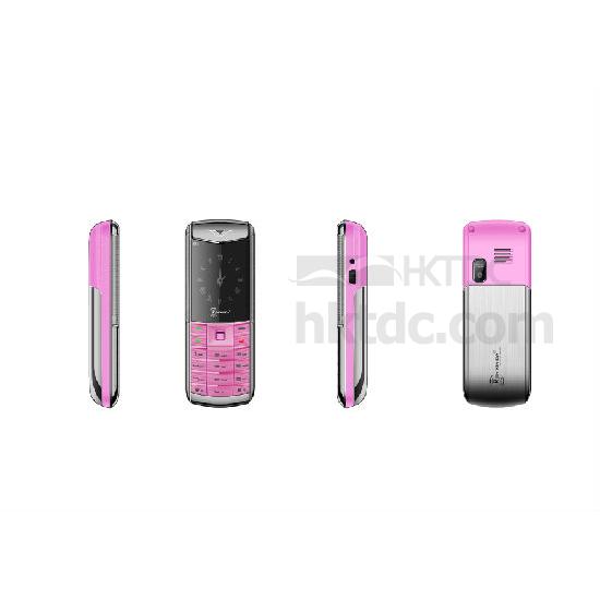 This is an elegant mobile phone with dual SIM bar type. It supports the FM radio, BT, camera, MP3, MP4 for added functionality. This pink body with silvery details makes this phone look chic and adorable.