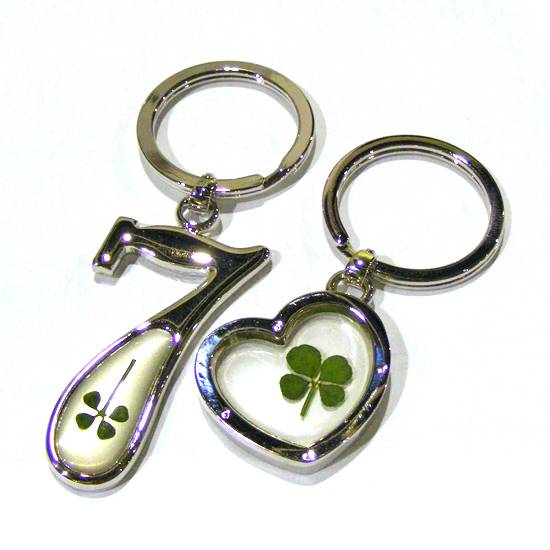 These are key holders which are made of silvery metals. The key holders are decorated with genuine 4 leaf-clovers.