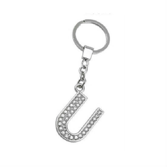 Highlighted here is a key ring shaped like the capital letter “U”. It has a silver toned exterior and is paved with gemstones on the letter. The king ring has a round split ring on top for attaching to keys and bags.