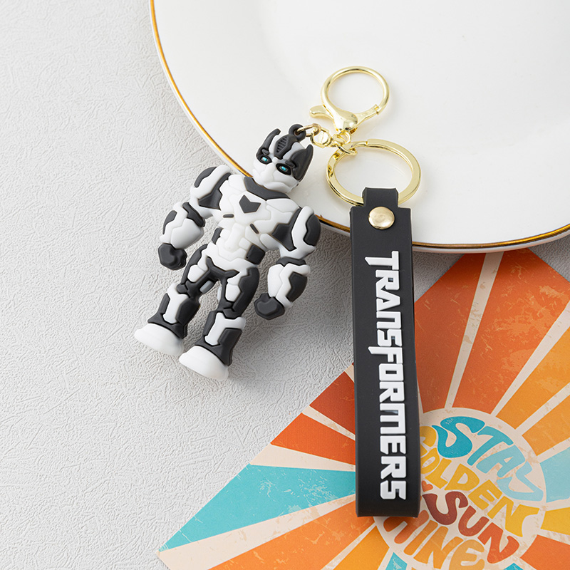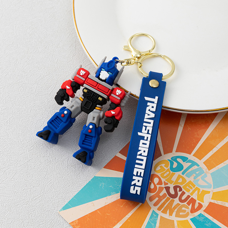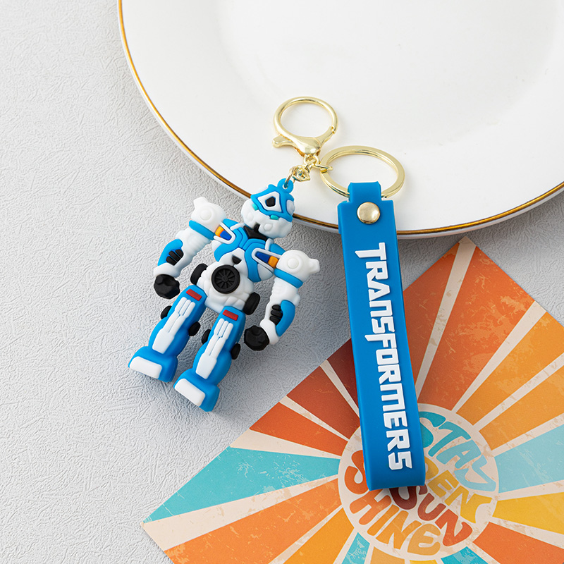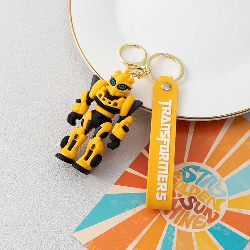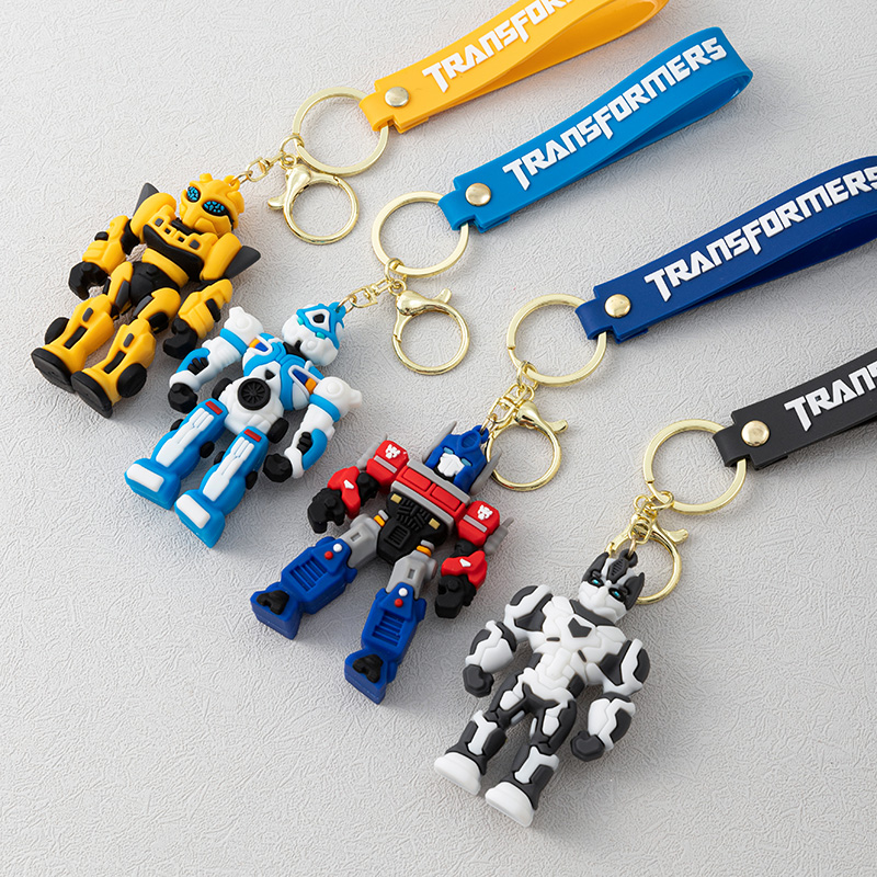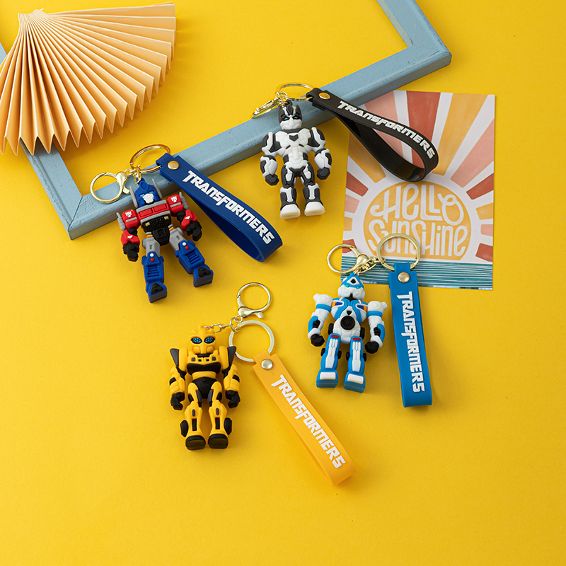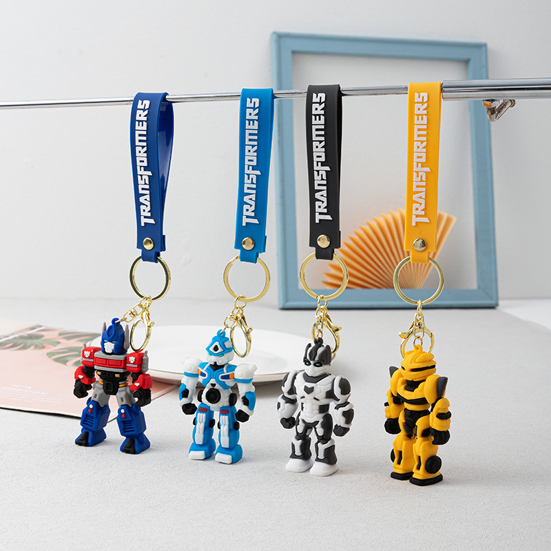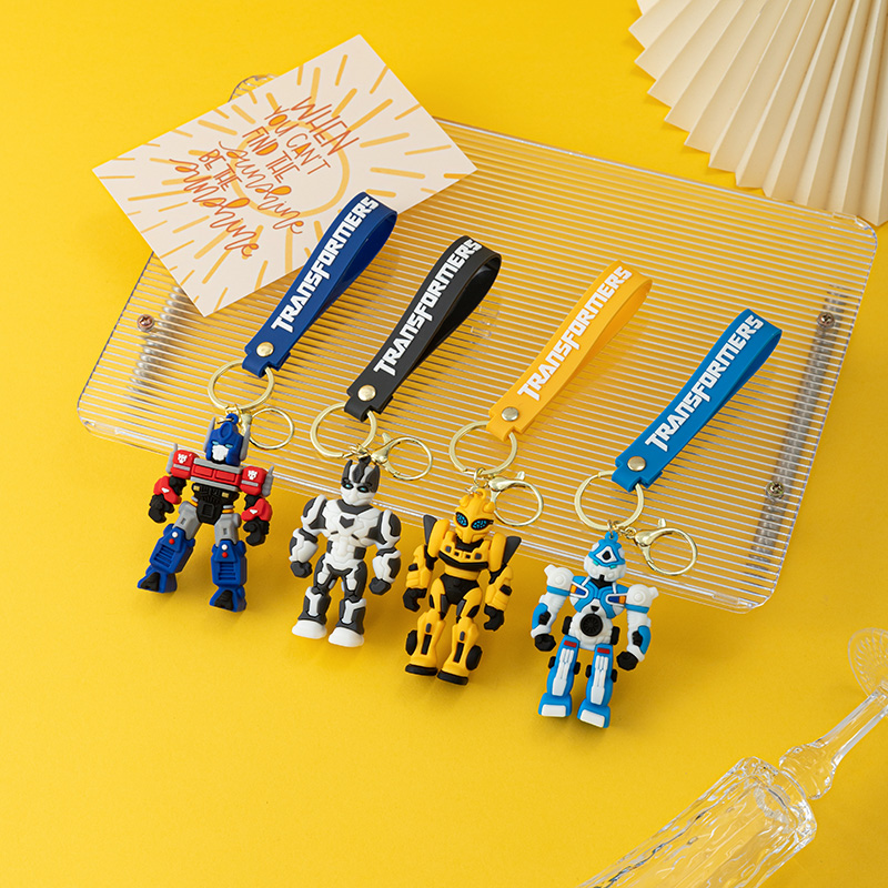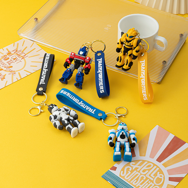 These are keychains. They feature 3D, miniature robot figurines in colors like yellow, blue, red, and black - and - white. Each comes with a strap in matching colors, printed with "TRANSFORMERS". Ideal for fans to organize keys or use as collectibles.
