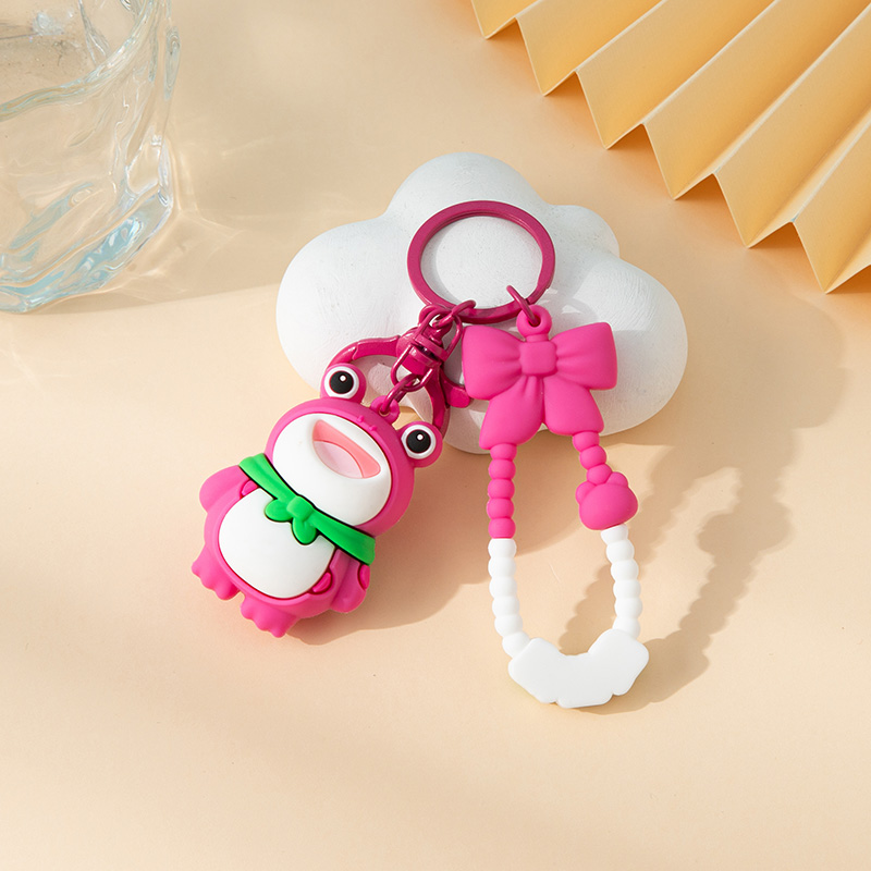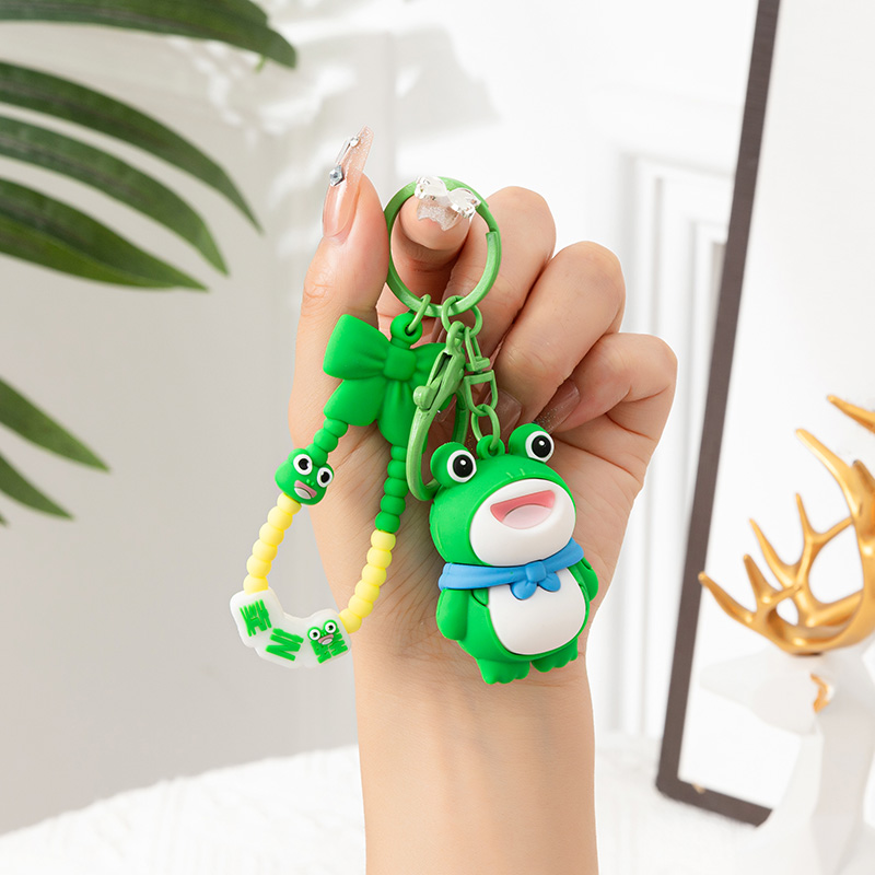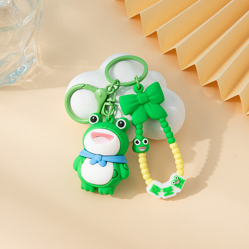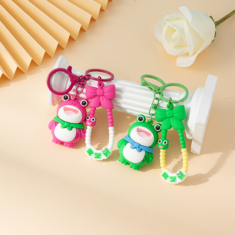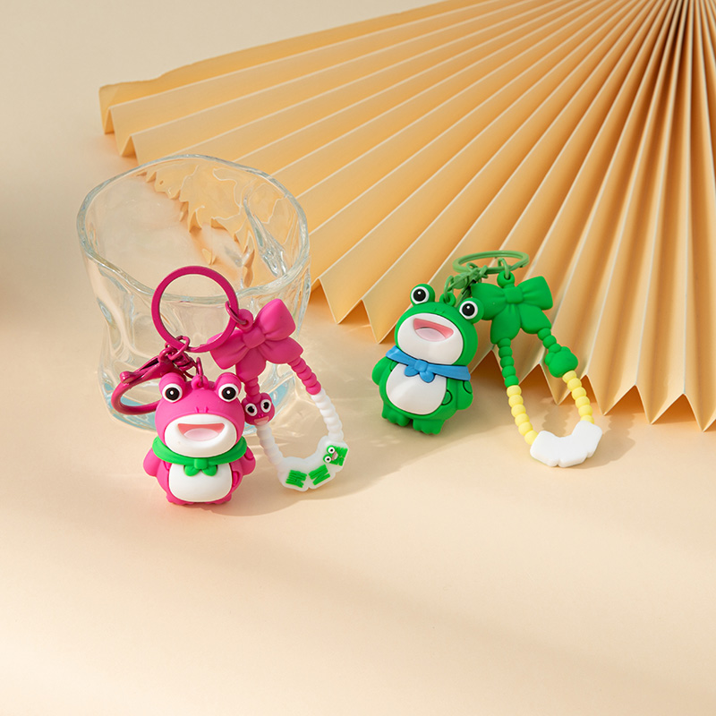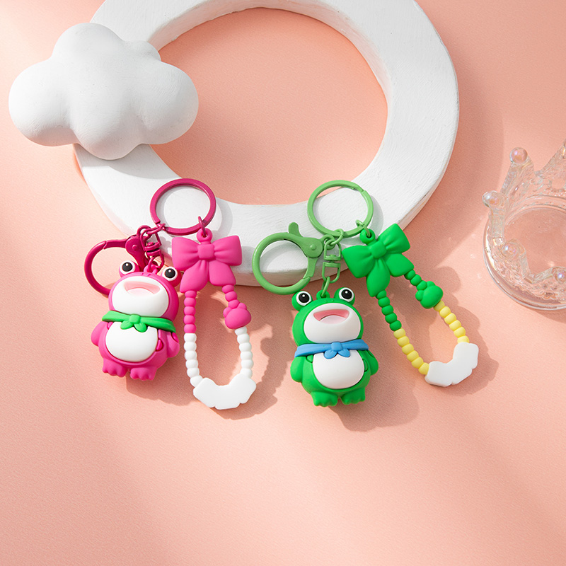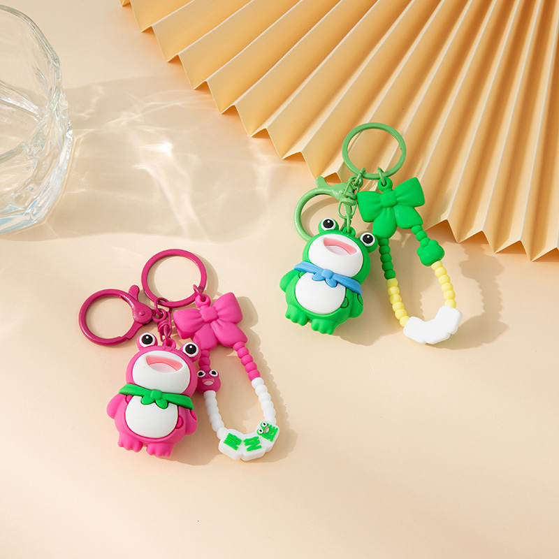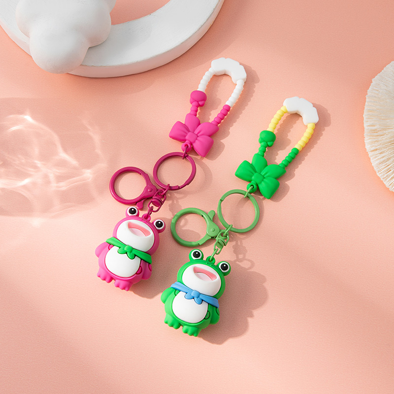 These are cute frog - shaped keychains. One is pink with a green bow, and the other is green with a blue bow. Their straps are adorned with bows in matching colors. Ideal for holding keys or as charming decorations for bags.