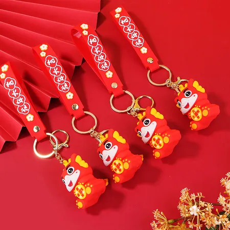 These are Chinese - style keychains. They feature cute, red lion - dance - themed figurines with yellow accents. The red straps have auspicious patterns. Ideal for holding keys, they also add a festive touch when attached to bags, perfect for Chinese festivals.