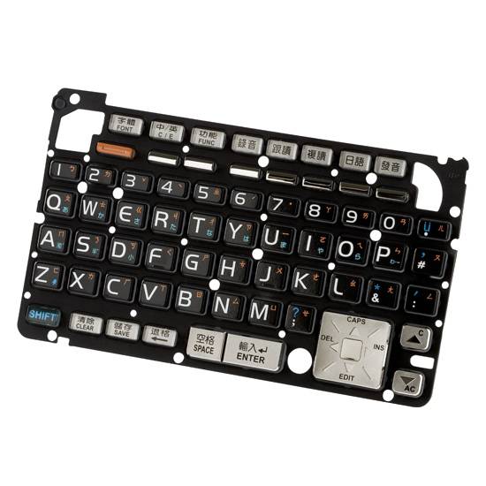 This is a plastic and rubber keypad for electronic products. It has a black ground to constrast the white English letters for a clear view. The keys have a soft and comfortable to touch feeling as well.