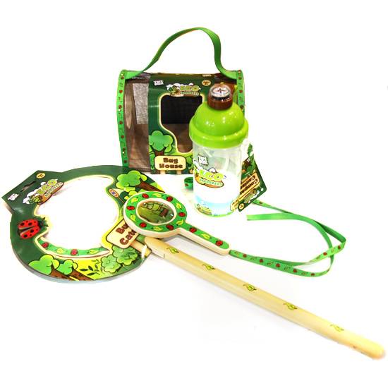 The picture shows a set of tools for kids to explore the wild environment. It consists of a magnifier, a bug catcher, a water bottle and a bug house, which are all printed with cute pictures of trees and leaves.