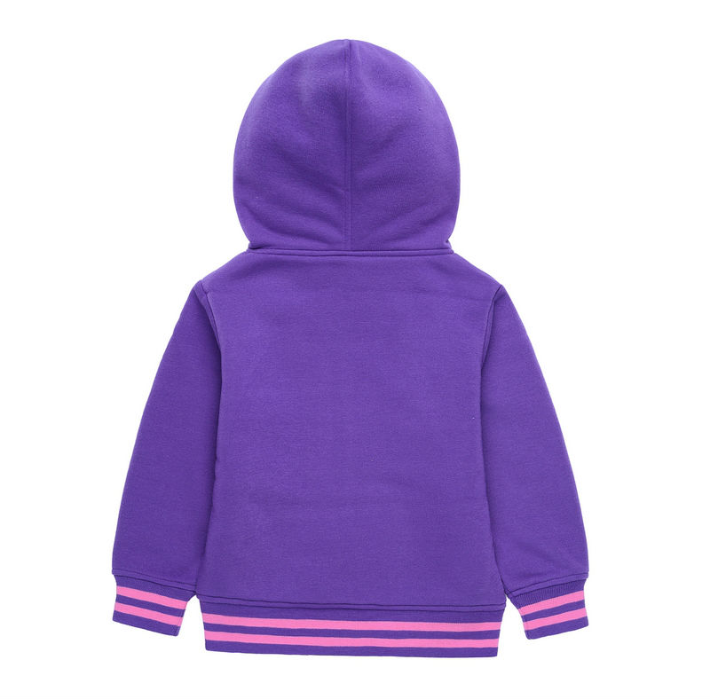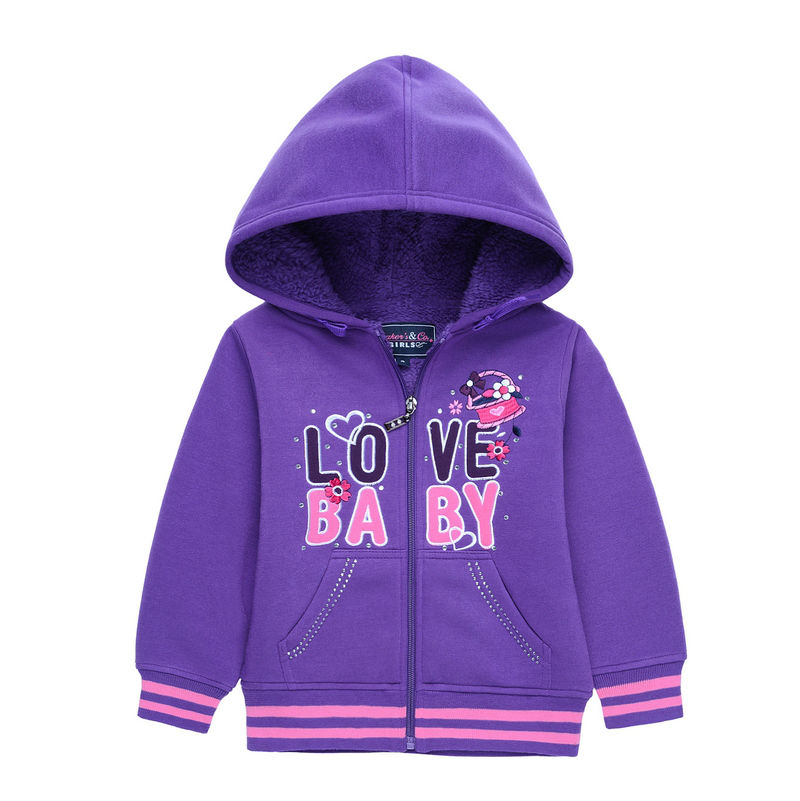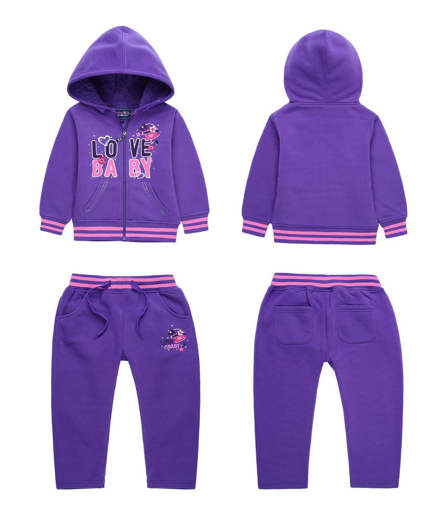 Great tracksuit with embroidery details is for girls. Soft material, thanks to inner coral fleece makes it easy to wear, as well as cute embroidery at the front of the top and pant, striped ribbed cuffs, waist and hemline. Comfortable for doing sports as well as casual
