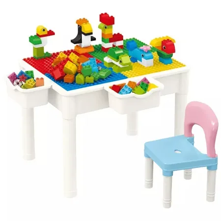 Comes with 1 activity table ( compatible lego ), 60 building blocks, 1 matched chair and 2 storage boxes.
