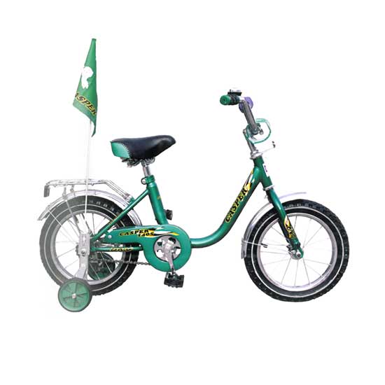This is a kids' bicycle that is professionally designed with a very strong structure. It is also equipped with two small supporting wheels for maximum safety. This bicycle comes with a matching flag for added fun.