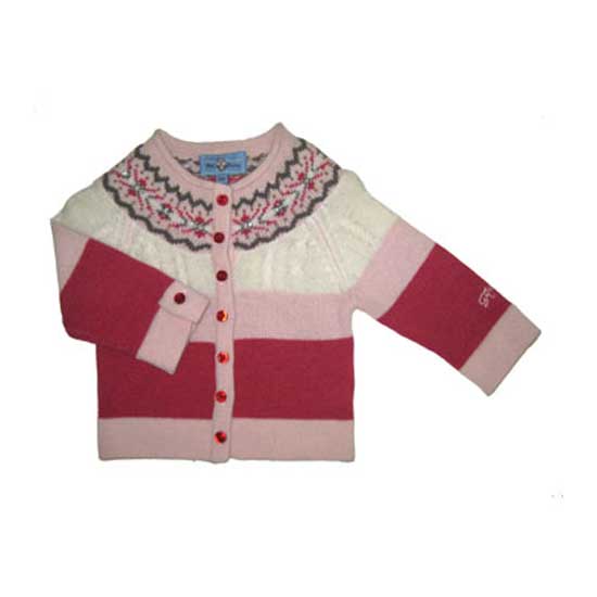 The showcased kids' cardigan comes with knitted construction with a red and pink striped pattern. Its button comes with a shimmering coating to add sophistication. This kids' cardigan is a lovely piece to keep young children warm in winter.