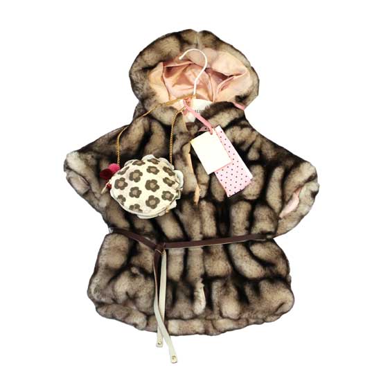 This is a kids' coat made of acrylic fur with light and dark brown patterns. It boasts a fashionable and trendy design with a big hood and a waistband. The soft coat is a great choice for keeping your kid warm on cold days.