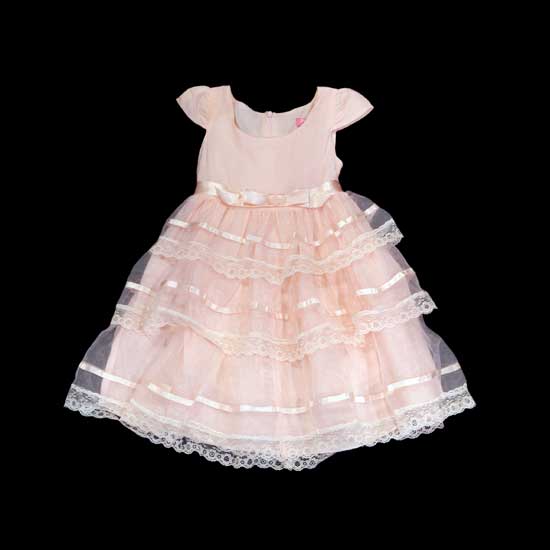 This charming dress in pink is a great choice for your loved child. It features translucent layers with trimmings on the skirt. This snug dress with cap sleeves is made of nylon and cotton.