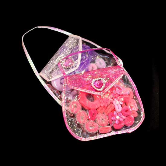 This is a beautiful hair ornament set available in different colors for children to choose from. It comes with assorted hair bands and clips in a clear handbag. The handbag is adorned with a shimmering heart-shaped embellishment for added charm.