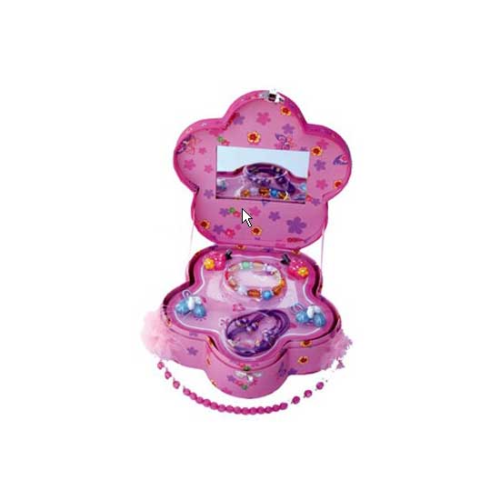 This kids' jewelry box has a housing in a five-petal blossom shape. It comes with a rectangular mirror on the inner side of the cover. The jewelry box boasts layers of compartments for organized storage of girls' jewelry.