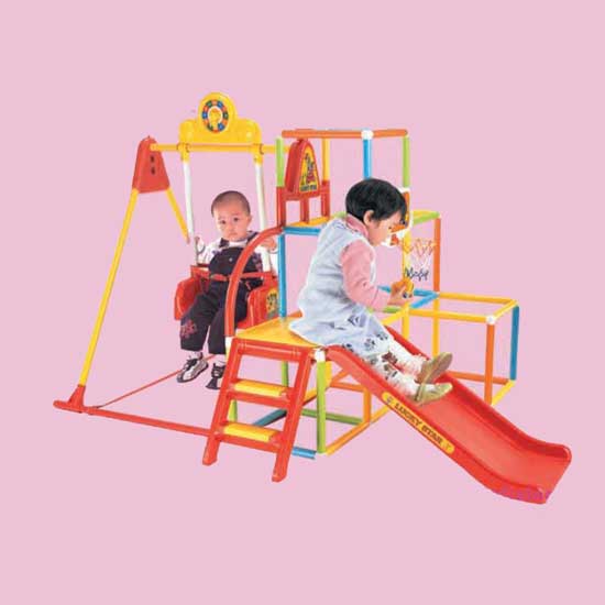 Shown here is a piece of kids' playground equipment mainly featuring a slide, a swing and some cuboid-shaped racks. The whole piece is crafted with dynamic colors that are visually stimulative to children. The equipment is ideal to be placed in open areas like household gardens.