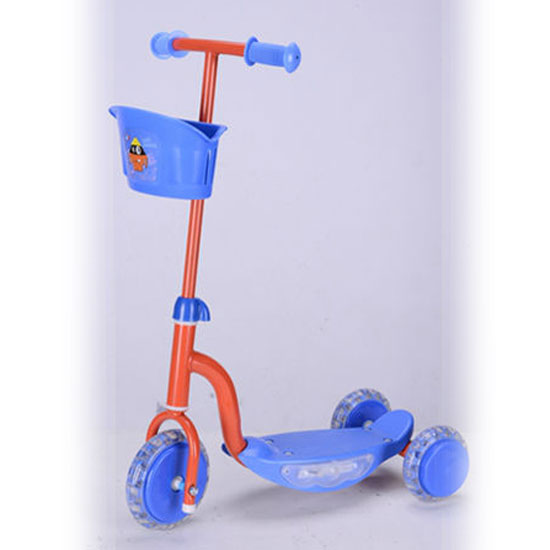 This scooter is sturdily built with three wheels and a steel frame. It features an eye-catching design in purple and orange. With a plastic basket, children can store their beloved toys and story books in it.