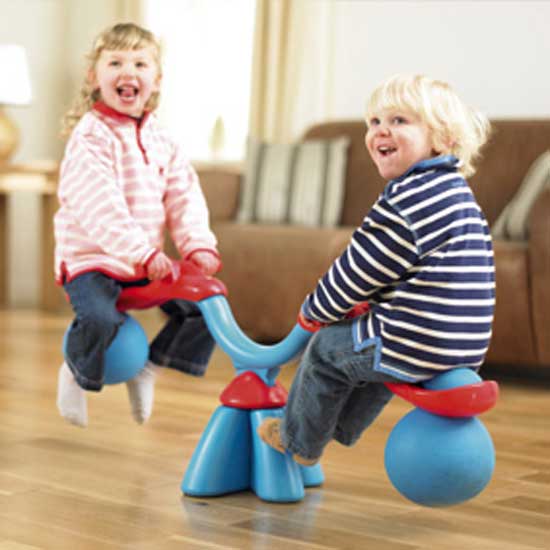 Pictured here is a kids' seesaw that can be played at home. This toy can provide a lot of fun to the players as it can perform bouncing and spinning. The seesaw is also fitted with two comfortable cushioned seats.