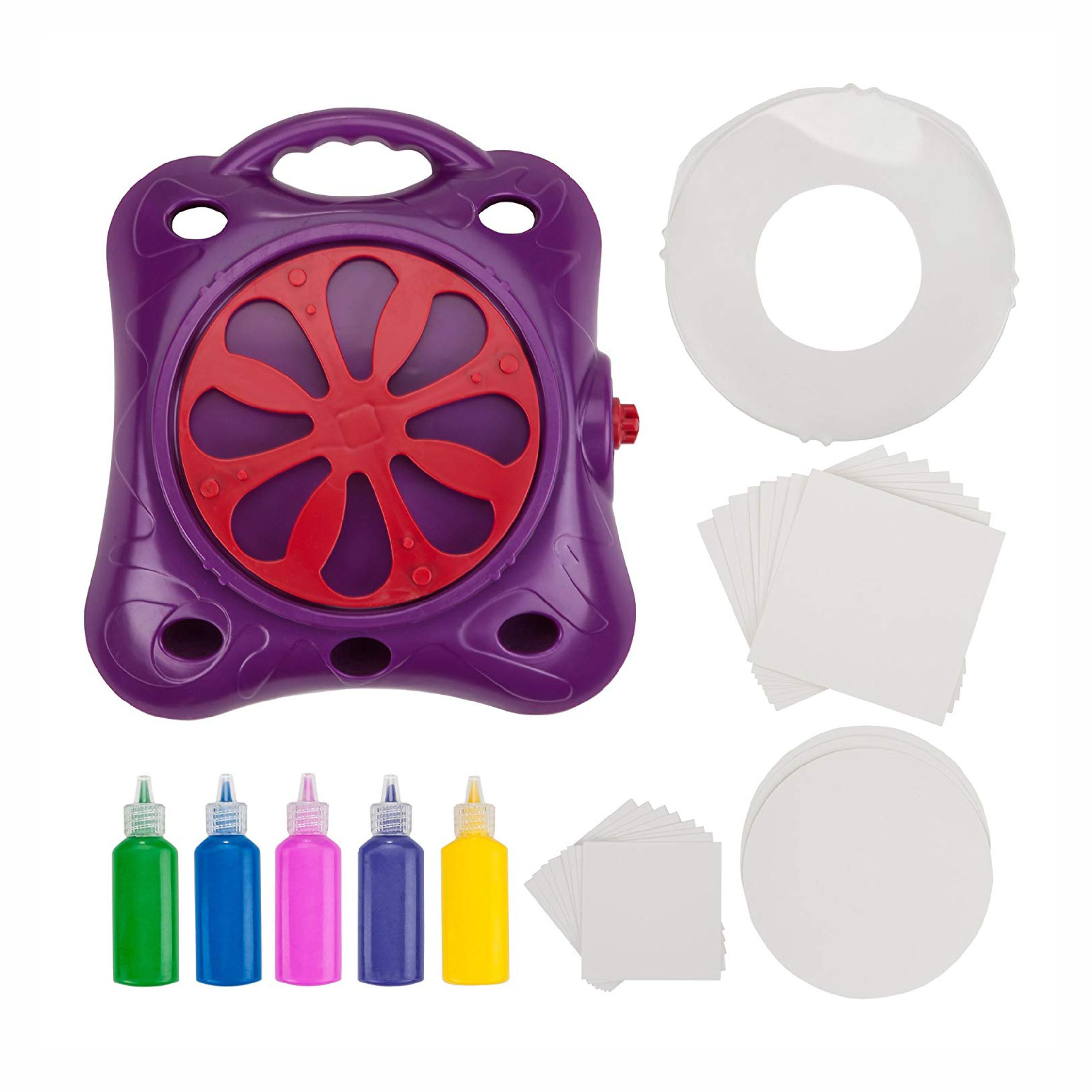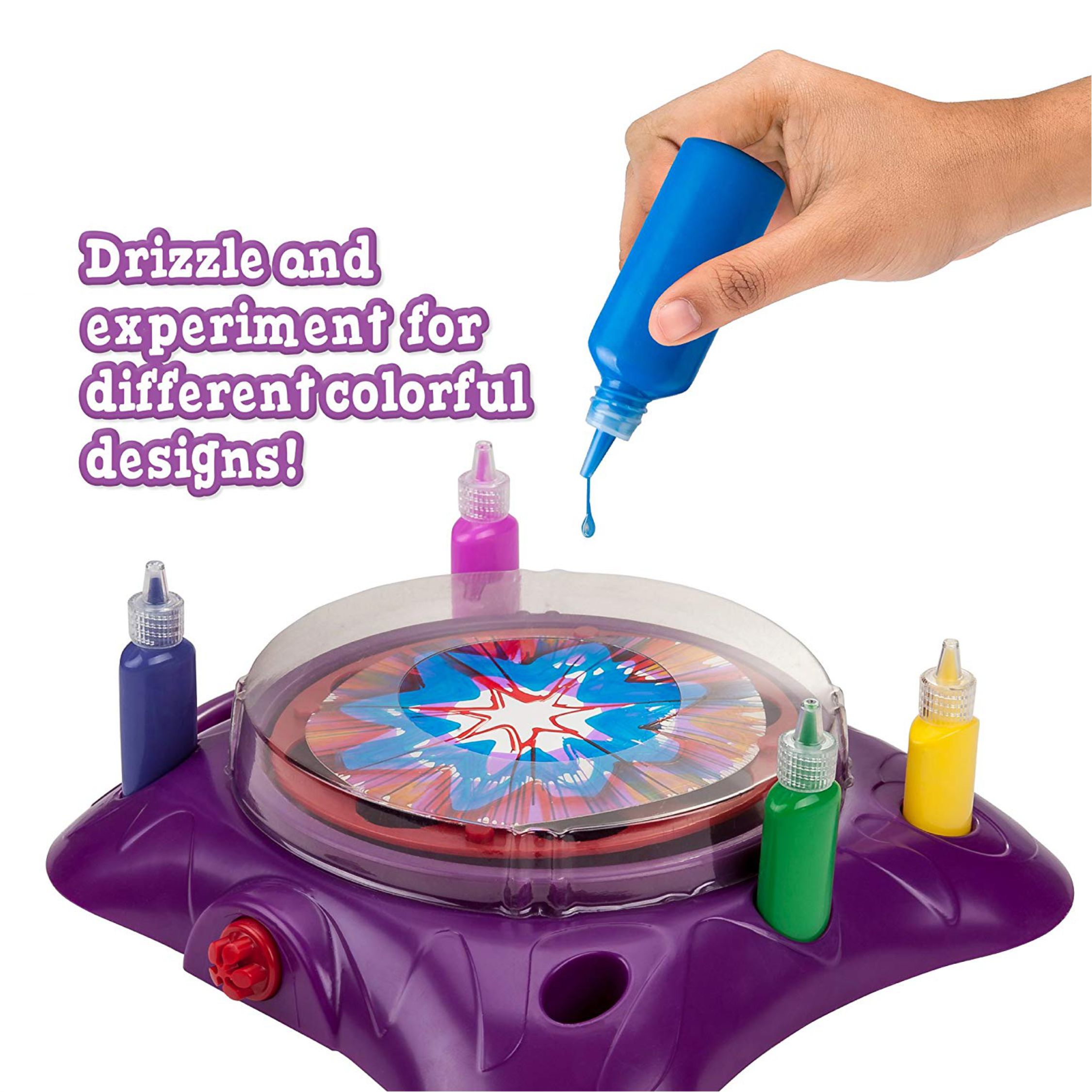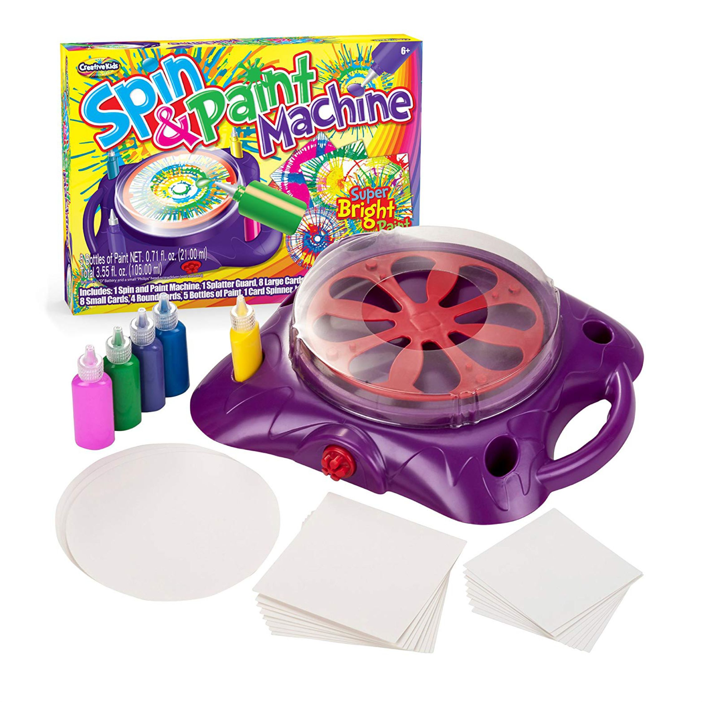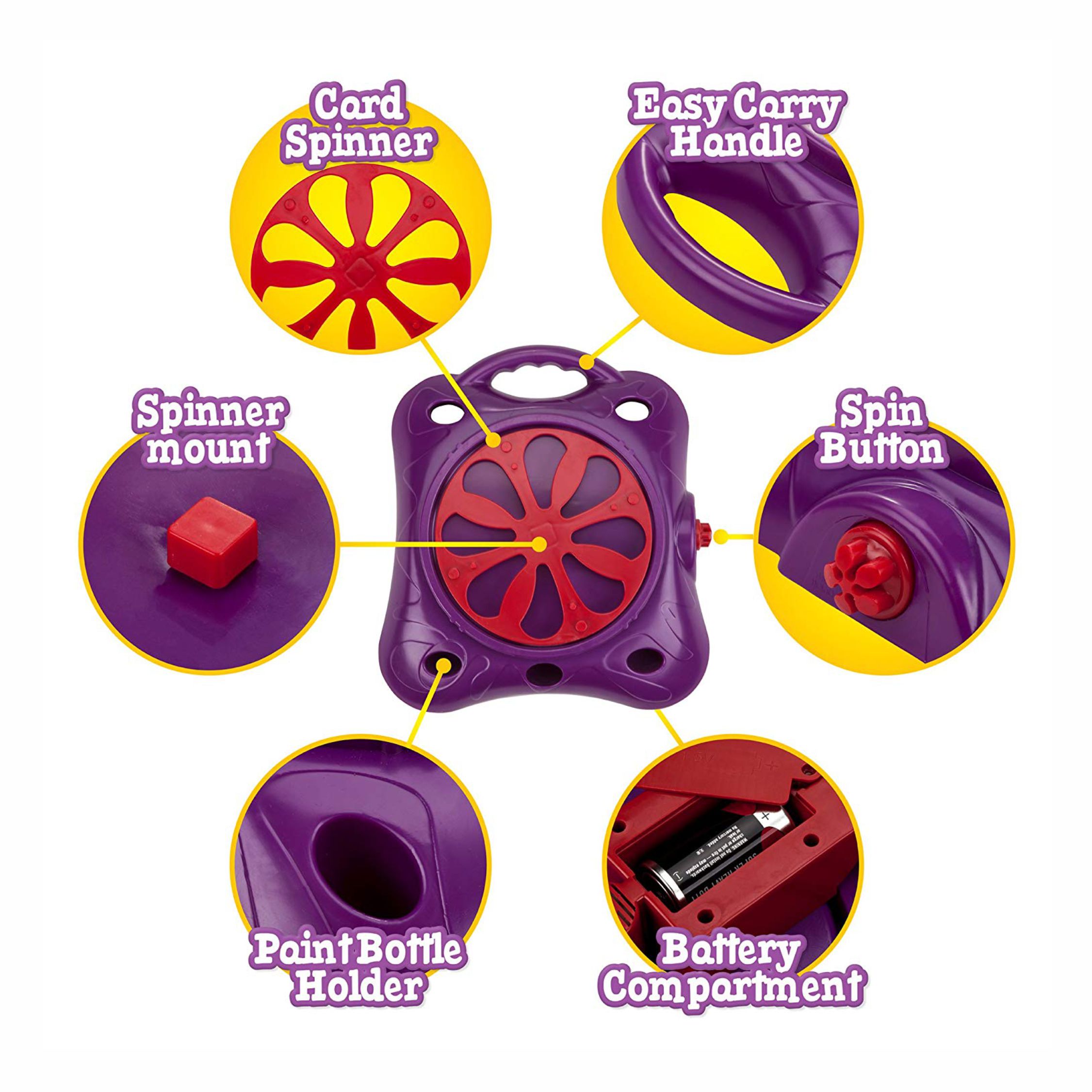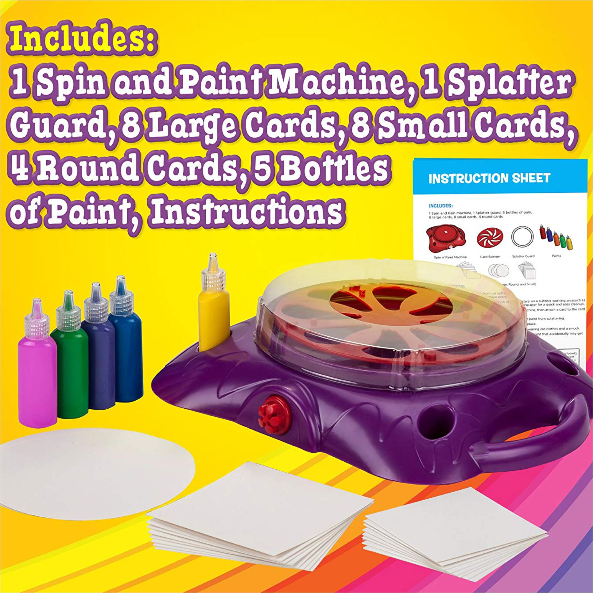 - Includes a spin and paint machine, a splatter guard, eight large cards, eight small cards, four round cards, five bottles of paint and instructions.