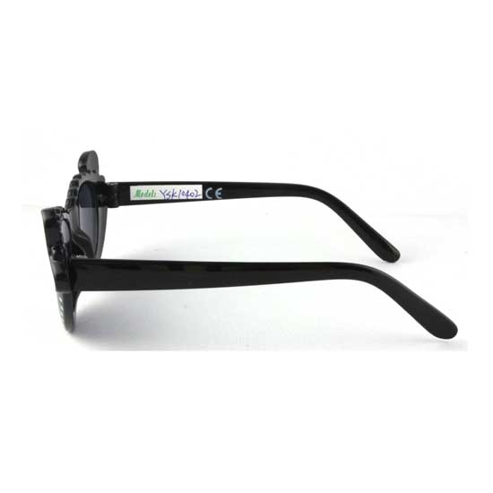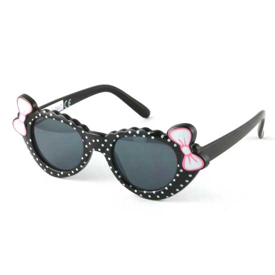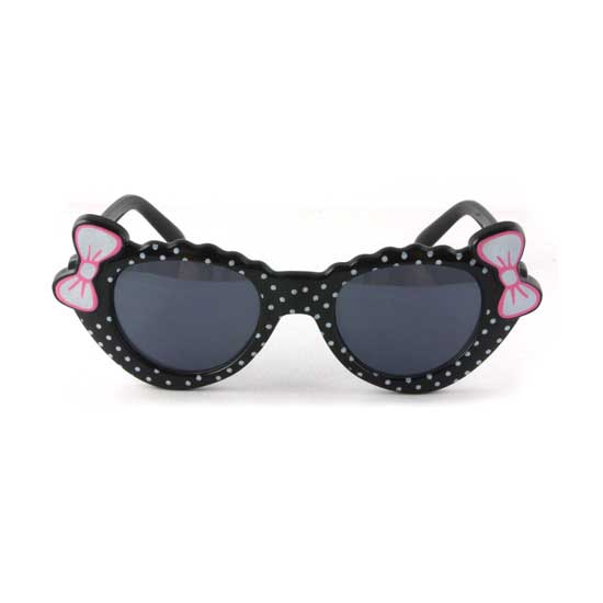 This pair of sunglasses comes with a black frame with white dots on the rims. The two sides of the piece feature ribbon designs colored in pink and white. The well-constructed sunglasses deliver great wearing comfort.