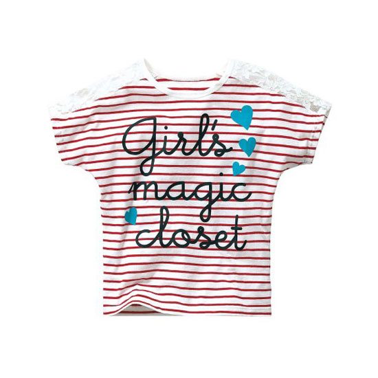 This is a kids’ T-shirt that comes with lace ornaments at the shoulders. The allover striped patterns add a touch of style to the whole piece. This stylish T-shirt is finished with a classic round neckline and short sleeves.