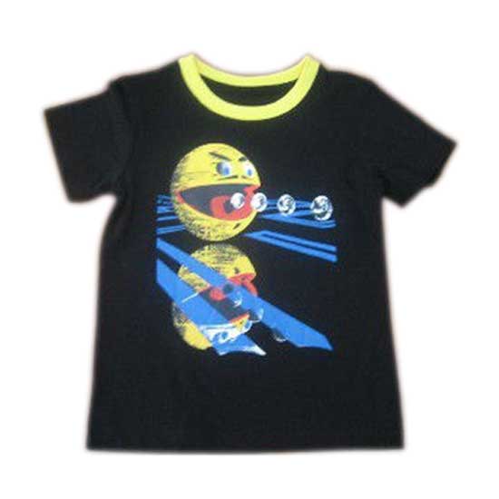 This black hued T-shirt with a yellow collar is made for kids. It features ball shaped yellow cartoon patterns and blue lines at the front. This appealing kids’ short-sleeved T-shirt updates your little one’s look immediately.