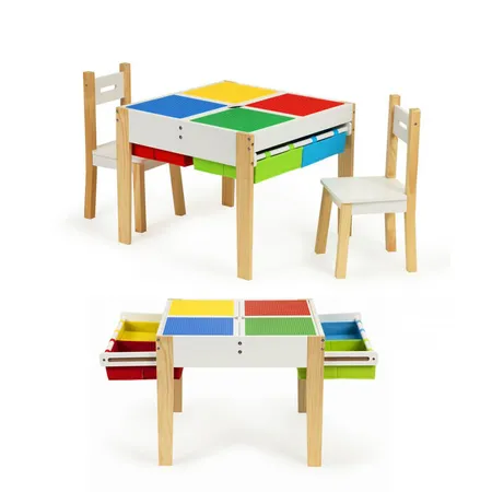 This kids table set combines functionality and vibrant design, perfect for any playroom or bedroom. Crafted from sturdy wood, it includes a table and two chairs, ensuring durability and safety for active kids. The set features colorful elements that capture children's imaginations, making activities more enjoyable. Integrated drawers provide convenient storage foraccessories, toys, or books, encouraging organization and tidiness. This charming set offers a welcoming space for creativity, learning, and play, making it an ideal addition to any child's space.